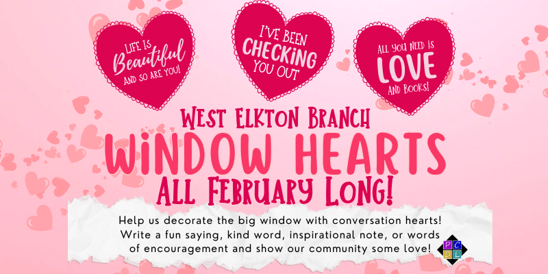 During the month of February, help the West Elkton Branch decorate the big picture window with conversation hearts customized by you! Write a fun saying, a kind word, an inspirational note, or a word of encouragement to show our community some love! Please stop in and fill our window. We look forward to seeing you!
